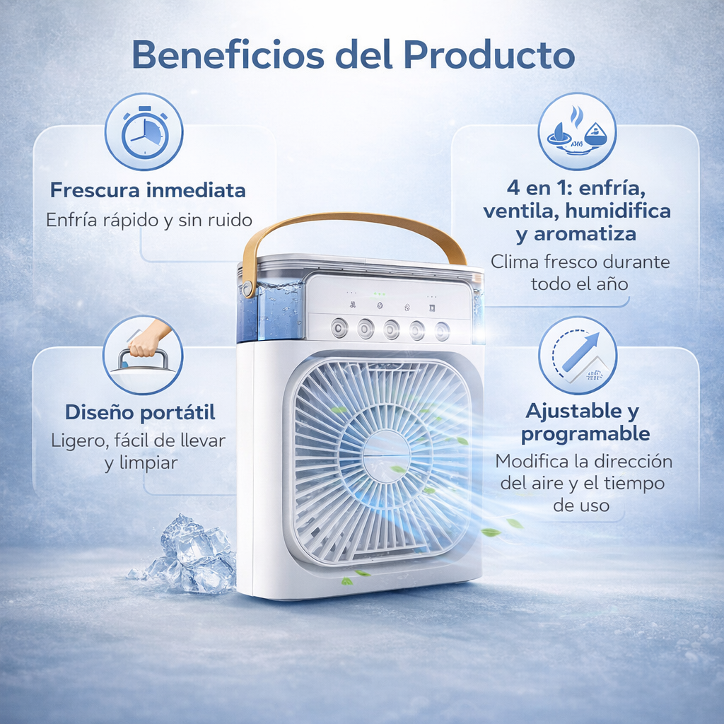 🌬️ 4 en 1: enfría, ventila, humidifica y aromatiza